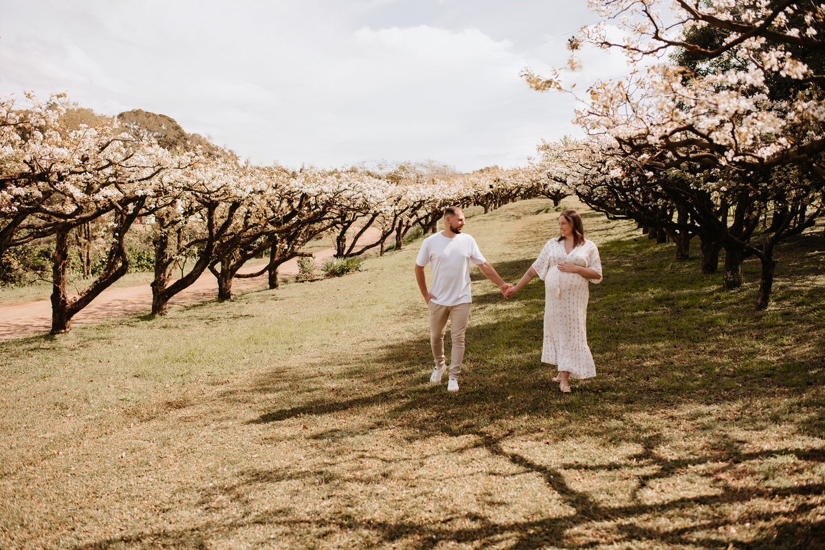 Escolhemos como cenário a Chácara Pasqual, com suas lindas pereiras floridas, trazendo um toque ainda mais mágico para a sessão. As fotografias guardam a expectativa, a ansiedade e o carinho dessa família que está prestes a viver uma nova aventura.